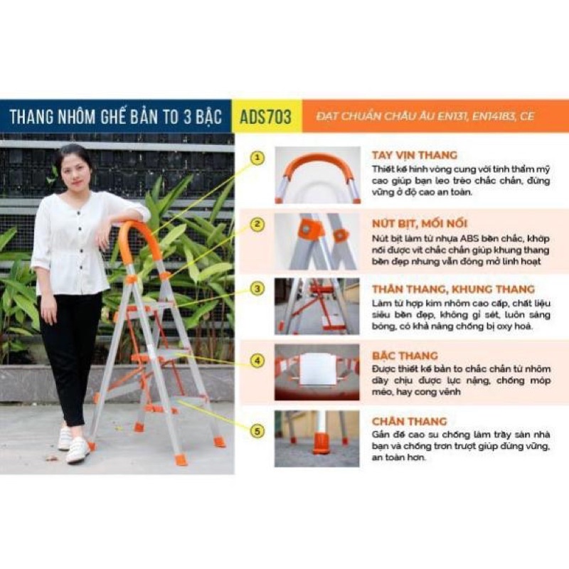 - Sản phẩm thang nhôm ghế 3 bậc Advindeq ADS-703 được thiết kế theo tiêu chuẩn an toàn châu Âu EN131, EN14183, CE. Thiết kế cẩn thận, tỉ mỉ, chắc chắn, tính an toàn cao.
