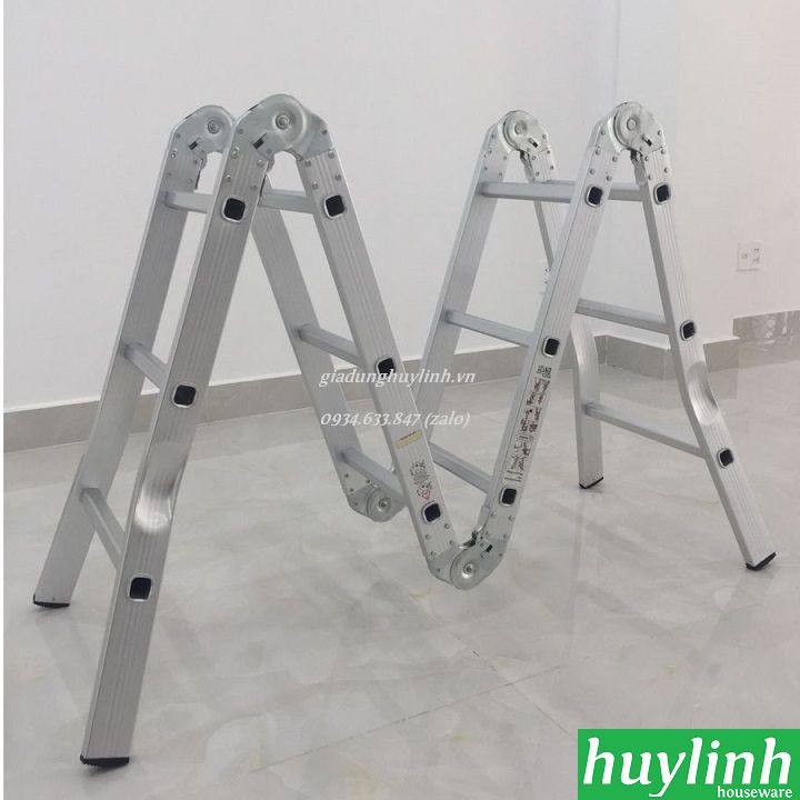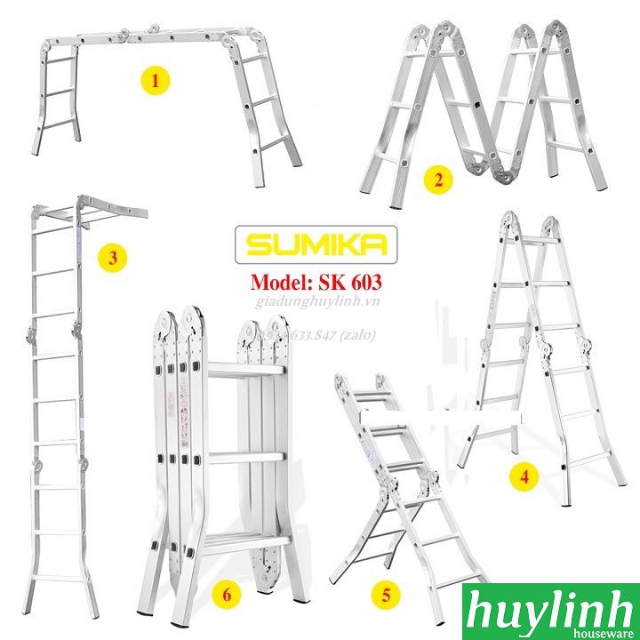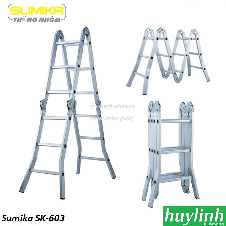 Thang nhôm gấp đa năng Sumika SK-603 có 4 đoạn, có thể gấp đa năng thành nhiều kiểu dáng như A, M, U, L, I tiện lợi, với chiều cao dài nhất chữ I là 3.4 métHuy Linh phân phối và bảo hành chính hãng tại Sumika Việt Nam