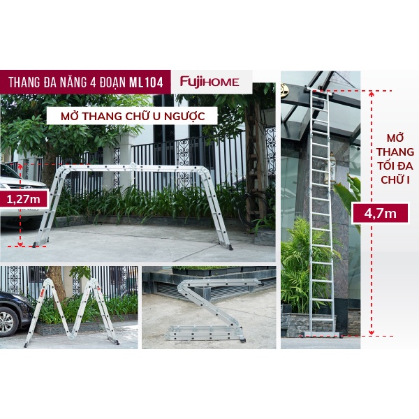 Giới thiệu Thang nhôm gấp 4 đoạn 4,7 MÉT đa năng nhập khẩu FUJIHOME ML104, thang chữ M gấp 4 khúc gia đình, Bảo hành 1 năm