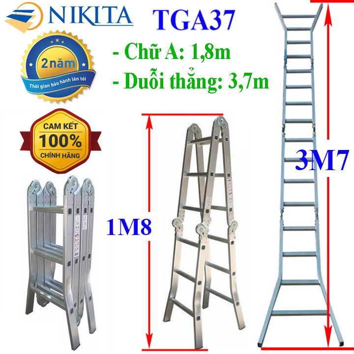Giới thiệu Thang nhôm gấp 4 đoạn - Chữ A 1,8m duỗi thẳng 3,7m - Nikita TGA37