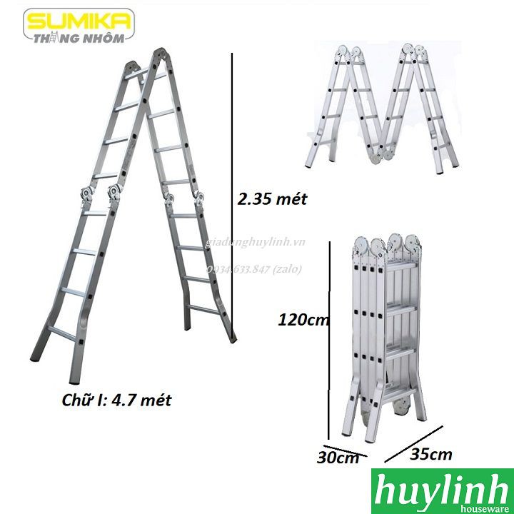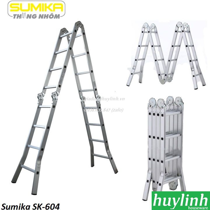 Thang nhôm gấp đa năng Sumika SK-604 với thiết kế đa năng gấp 4 đoạn cực kì tiện lợi, chiều cao chữ A là 2.35m, chữ I là 4.7 métHuy Linh phân phối và bảo hành chính hãng tại Sumika Việt Nam.