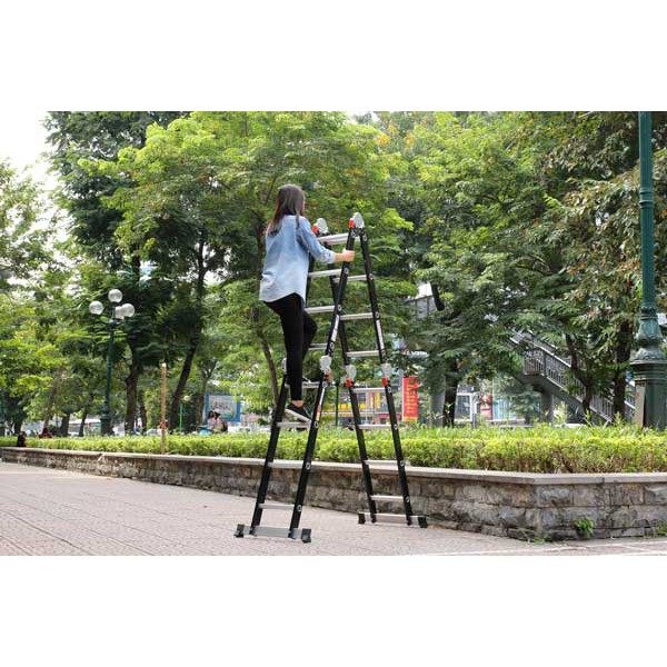 - Kích thước thang : ( Cao tối đa xếp chữ A ) : 2260mm x ( Cao tối đa duỗi thẳng chữ I ) : 4640mm x ( Cao khi xếp hình thang U lộn ngược ) : 1250mm x ( Cao khi gấp gọn ) : 1230mm x ( Rộng ) : 360mm.
