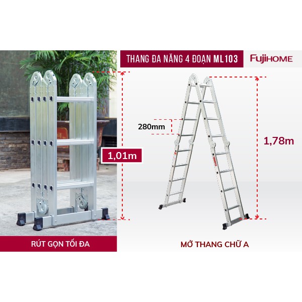 Thang nhôm gấp đa năng 4 đoạn, 12 tư thế sử dụng FUJIHOME ML103 ( Chiều cao chữ I 3.7m, chữ A 1.78m) Bảo hành 1 năm