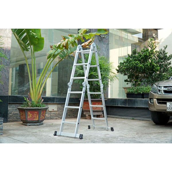 – Thang nhôm gấp đa năng yêu cầu hỗ trợ mặt bằng cho 4 điểm tiếp xúc. Nếu điều kiện nơi làm việc không có đủ hoặc không bằng phẳng để có thể lắp đặt thang, người dùng vẫn có thể điều chỉnh thang sang chữ A, chữ I hoặc điều chỉnh chân thang tùy theo mặt phẳng.