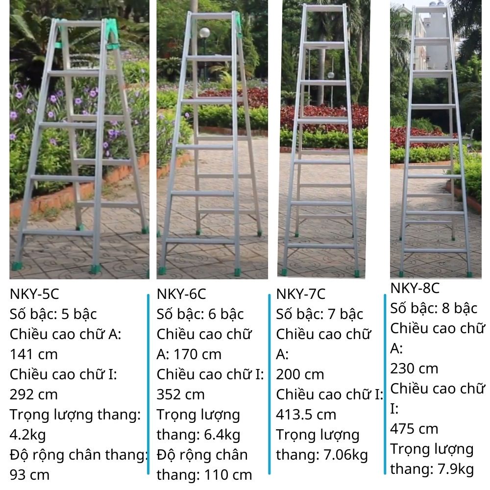 - NKY-8C, số bậc 1 bên: 8, Chiều cao chữ A: 230cm, Chiều cao chữ I: 475cm, Trọng lượng: 7.9kg