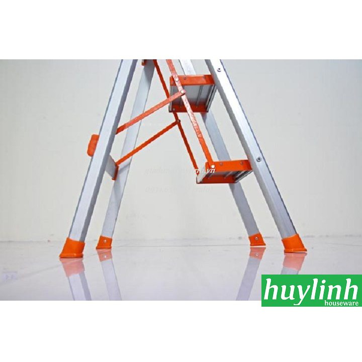 - Chân thang được duỗi theo kiểu hình chữ A nên có thể đứng một mình trên mặt phẳng mà không cần điểm tựa thang. Rất vững chắc, ít bị cong vênh. Tải trọng 150kg bằng trọng lượng 2 người lớn cùng đứng một lúc trên thang.