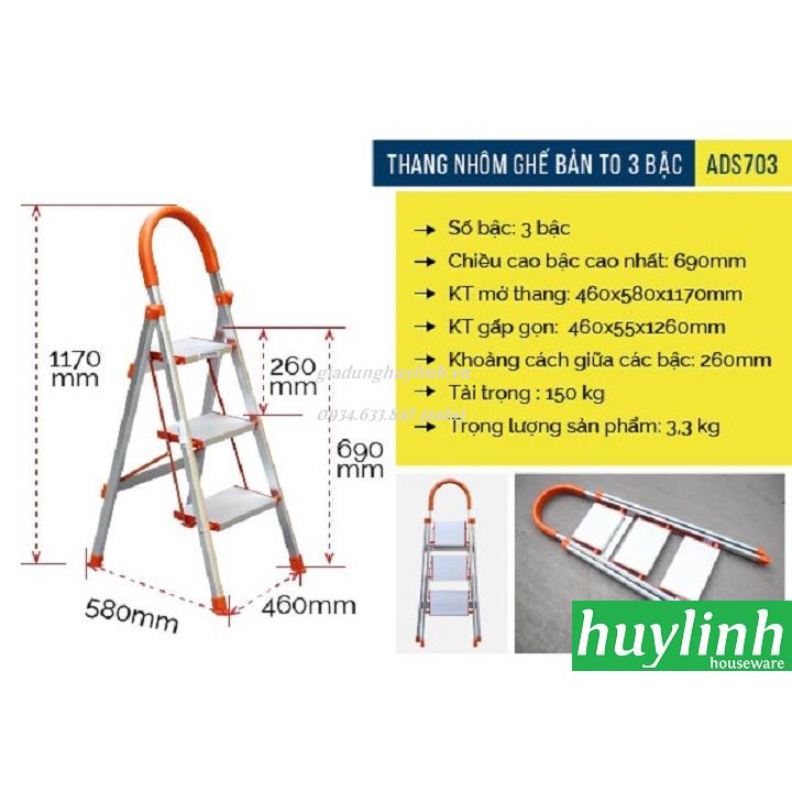 Thang nhôm ghế Advindeq ADS-703 có 3 bậc bản to, chiều cao bậc cao nhất 690cm tiện lợi, thang được thiết kế từ hợp kim nhôm cao cấp.Huy Linh phân phối và bảo hành chính hãng Advindeq Việt Nam