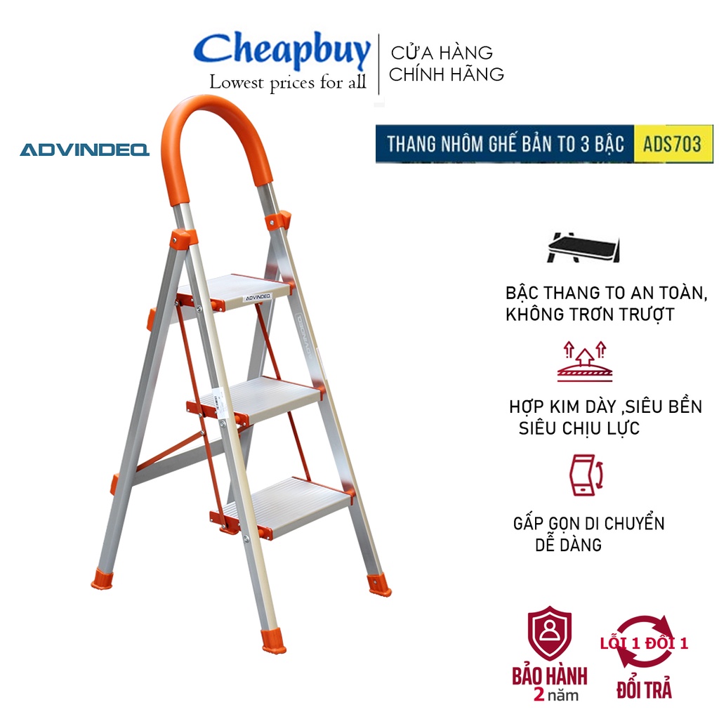 Thang nhôm ghế 3 bậc gấp gọn bản to nhập khẩu ADVINDEQ ADS-703, có tay vịn , bảo hành 24 tháng