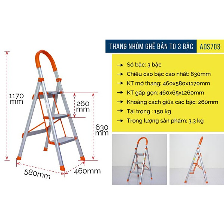 THÔNG SỐ KỸ THUẬT CỦA THANG NHÔM GHẾ 3 BẬC BẢN TO XẾP GỌN ADVINDEQ ADS703