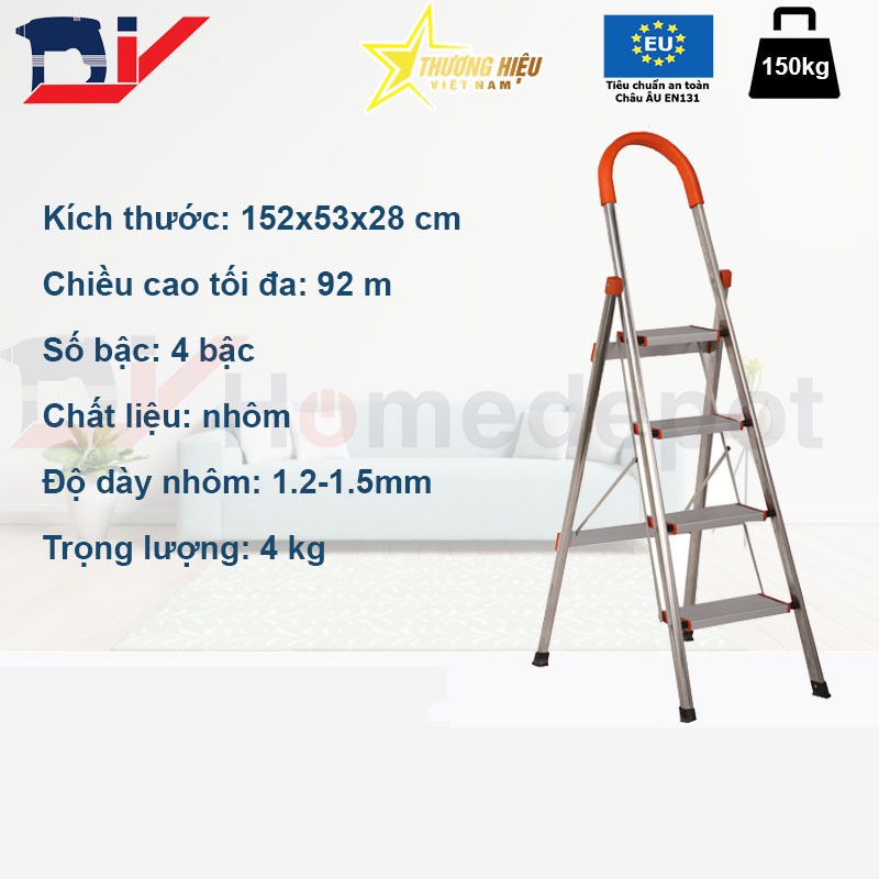Thang nhôm ghế 4 bậc DIY TLN-04 chiều cao sử dụng 92cm, tải trọng 150kg - Hàng chính hãng - tiêu chuẩn an toàn Châu Âu