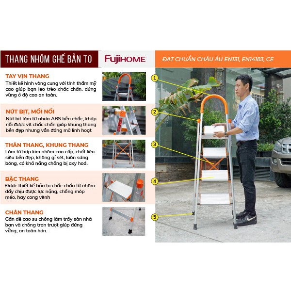 Nhà cửa & Đời sống > Dụng cụ & Thiết bị tiện ích > Thang || Thang nhôm ghế 4 bậc gấp gọn gia đình bản to có tay vịn FUJIHOME SL-304 ( bậc cao 97cm ) bảo hành 1 nămCòn hàng