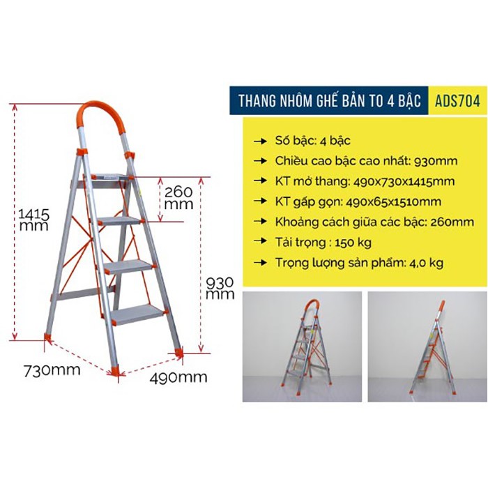 THÔNG SỐ KỸ THUẬT CỦA THANG NHÔM GHẾ 4 BẬC BẢN TO XẾP GỌN ADVINDEQ ADS704