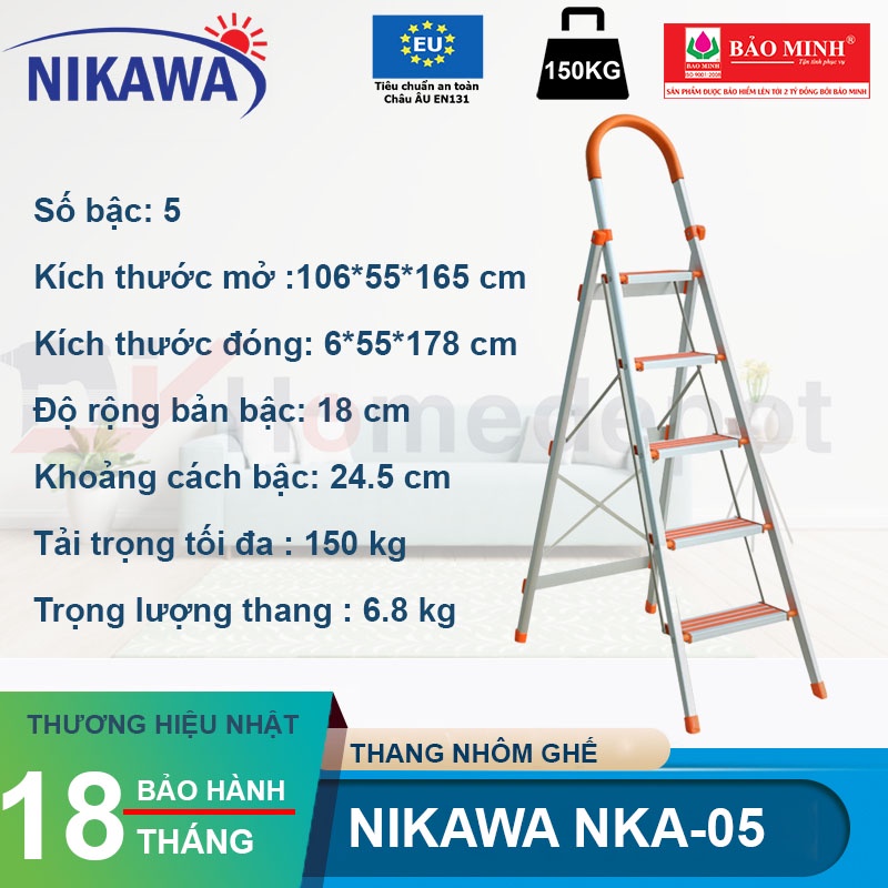 Giới thiệu Thang nhôm ghế 5 bậc chữ a có tay vịn gấp gọn Nikawa nhập khẩu Nhật Bản, bảo hành 18 tháng NKA-05