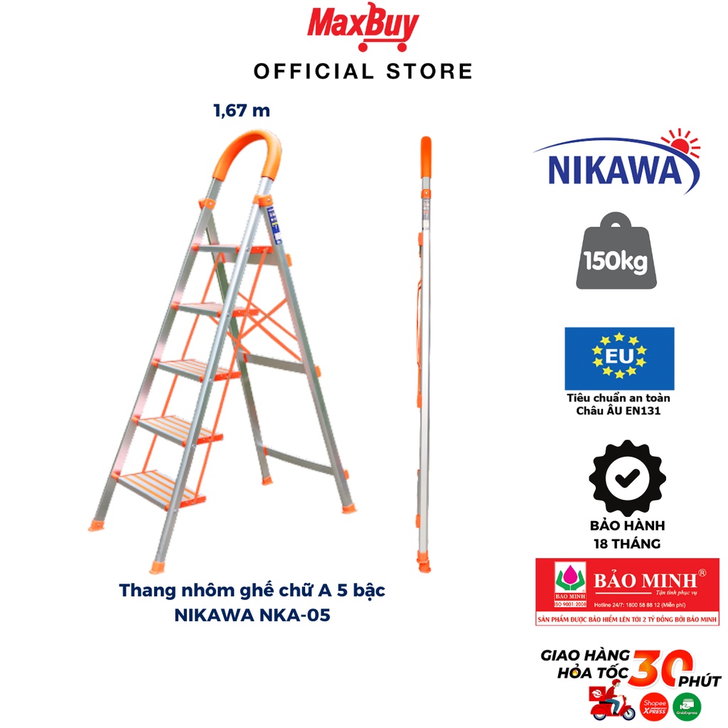 Thang nhôm ghế 5 bậc chữ a có tay vịn gấp gọn Nikawa nhập khẩu Nhật Bản, bảo hành 18 tháng NKA-05