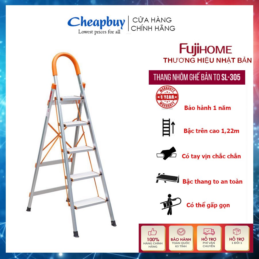 Giới thiệu Thang nhôm ghế 5 bậc chữ A gấp gọn có tay vịn bậc to chắc chắn FUJIHOME SL-305 ( bậc cao 1,22m) Bảo hành 1 năm