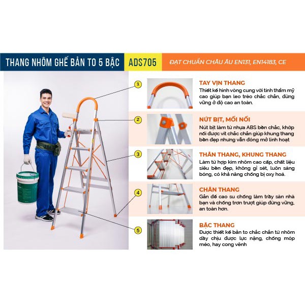 - Sản phẩm thang nhôm ghế 5 bậc Advindeq ADS-705 được thiết kế theo tiêu chuẩn an toàn châu Âu EN131, EN14183, CE. Thiết kế cẩn thận, tỉ mỉ, chắc chắn, tính an toàn cao.