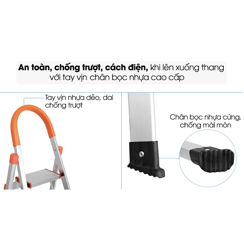 Ngoài ra, chân đế của thang nhôm 6 bậc DIY TLN-06 được bao bọc bằng nhựa chắc chắn, chống trơn trượt và đứng được ở mọi địa hình. Có tay vịn ngang tầm đầu gối giúp cho việc tựa cũng như vịn vào để tạo độ an tâm cho người dùng khi lên thang hoặc đứng trên ghế.