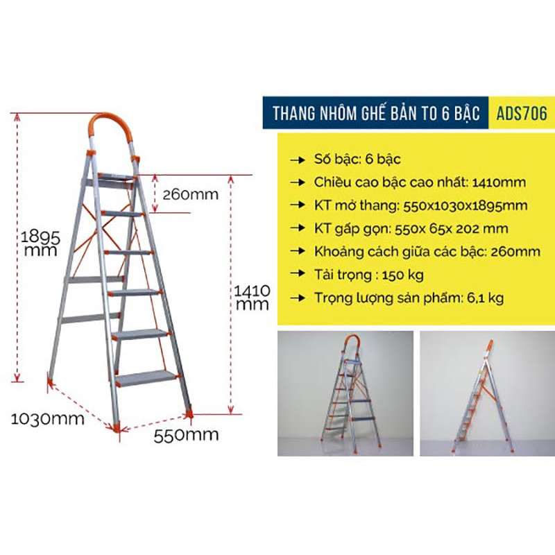 THÔNG SỐ KỸ THUẬT CỦA THANG NHÔM GHẾ 6 BẬC BẢN TO XẾP GỌN ADVINDEQ ADS706