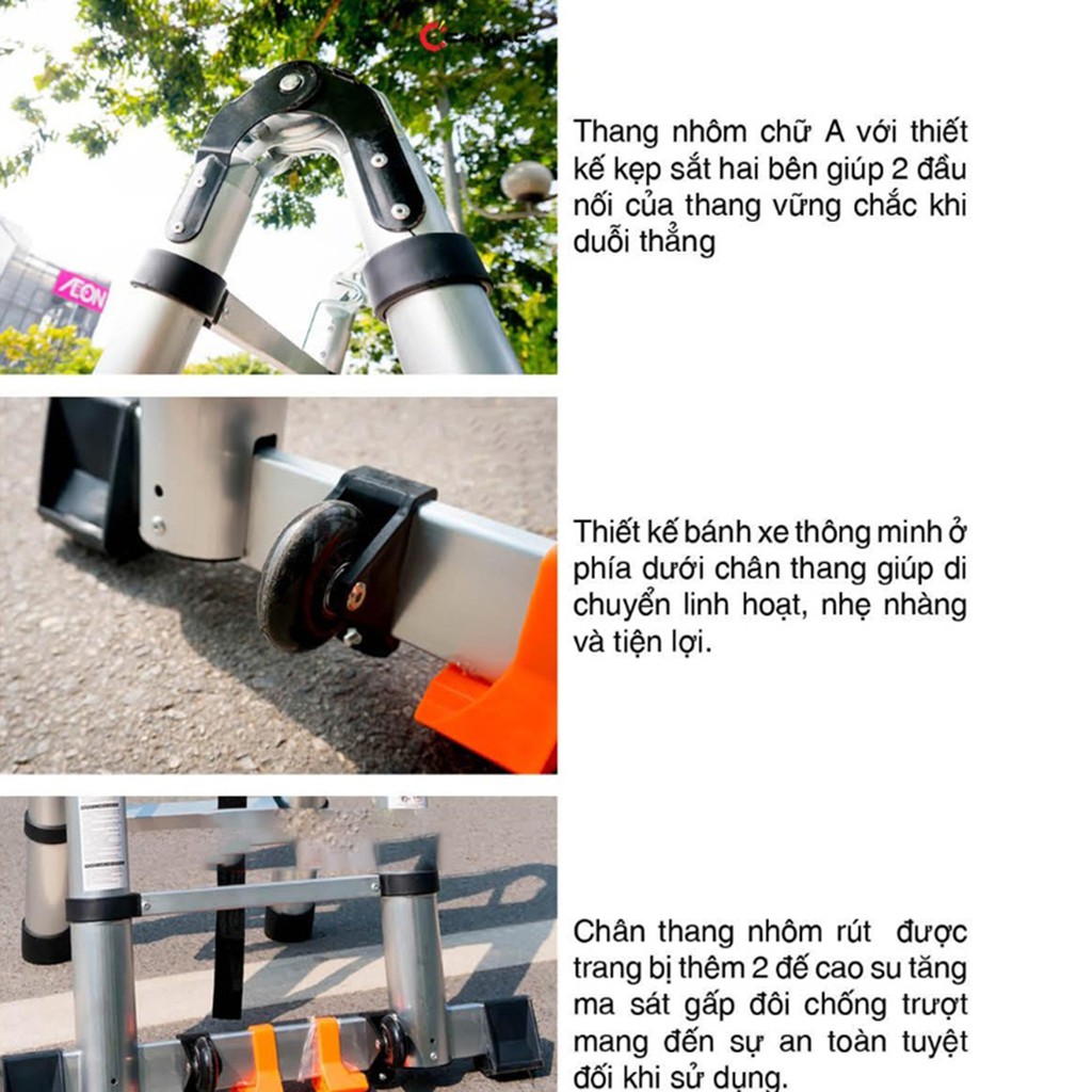 - - đảm bảo an toàn cho người sử dụng.- Chân thang được làm bằng cao su, tăng thêm độ bán cho thang không bị trơn trượt đảm bảo an toàn cho người sử dụng.