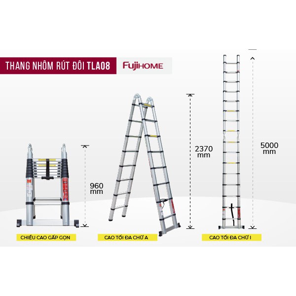 Thang nhôm rút chữ A gấp gọn nhập khẩu cao 5M FUJIHOME TLA08, thang rút đôi xếp gọn gia đình đa năng