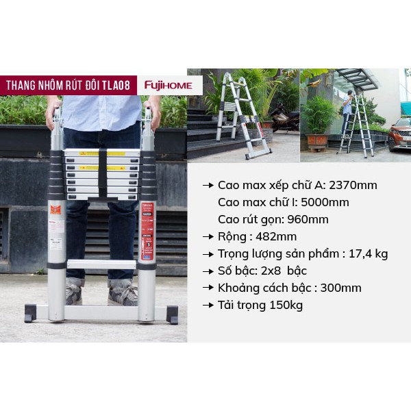 Giới thiệu Thang nhôm rút chữ A gấp gọn cao 5M nhập khẩu Nhật Bản FUJIHOME TLA08, rút đôi xếp gọn gia đình đa năng - Bảo hành 1 năm