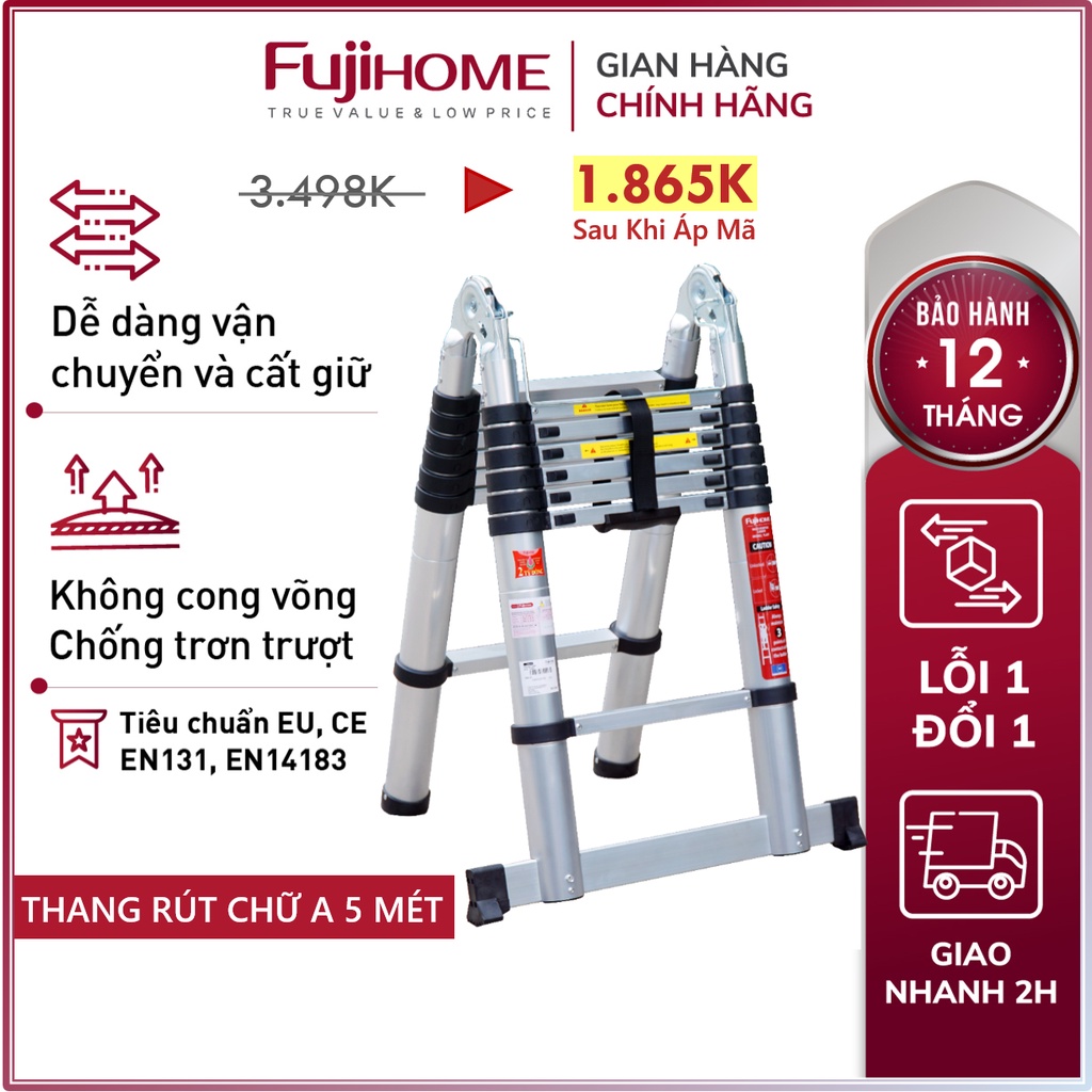 Thang nhôm rút chữ A Nhập Khẩu 4,4M - 5M gấp gọn chính hãng FUJIHOME, thang rút đôi xếp gọn gia đình đa năng Nhật Bản
