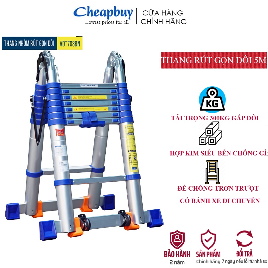 Nhà cửa & Đời sống > Dụng cụ & Thiết bị tiện ích > Thang || Thang nhôm rút chữ A nhập khẩu 5M gấp gọn chính hãng ADVINDEQ ADT708BN chống trượt, bánh xe di chuyển -Bảo hành 2 nămCòn hàng