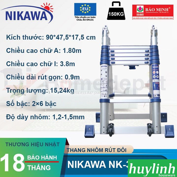 Thang nhôm rút đôi Nikawa NK-38AI cực kì an toàn khi sử dụng, với chiều cao chữ A là 1.9m và chiều cao duỗi thẳng chữ I là 3.8m.Huy LInh phân phối và bảo hành chính hãng tại Nikawa Việt Nam