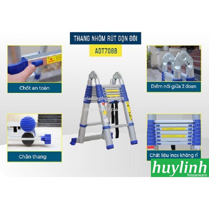 - Thang nhôm rút gọn chữ Advindeq ADT708B là loại thang rút đa năng có thể dựng chữ A cho người sử dụng đứng mà không cần có điểm dựa vào, ngoài ra thang còn có thể dựng đứng lên chữ I với chiều cao gấp đôi so với chữ A.