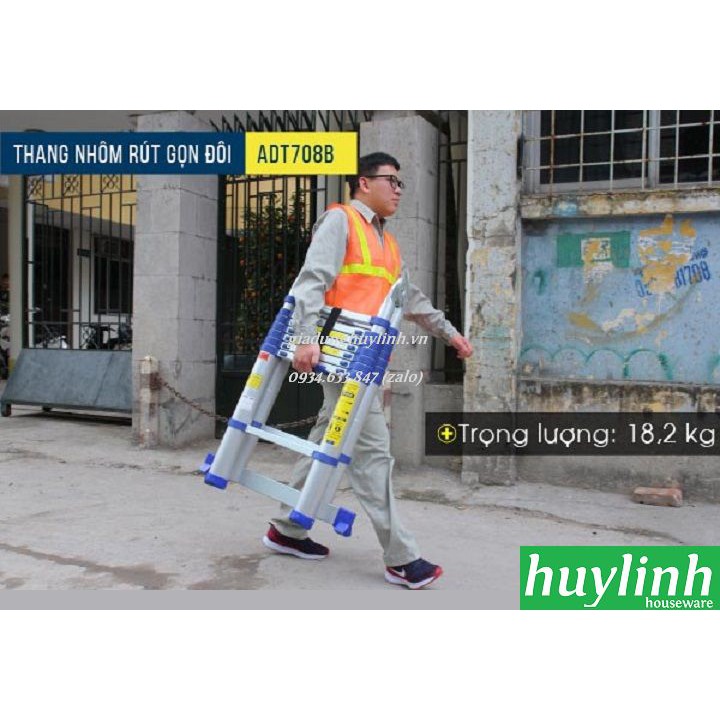 Thang nhôm rút đôi Advindeq ADT708B là dòng thang rút gọn chữ A với kích thước chữ A là 2.37m, kích thước chữ I là 5 mét, và khi gấp gọn chỉ còn 0.95 mét dễ dàng cất giữHuy Linh phân phối và bảo hành chính hãng tại Advindeq Việt Nam.