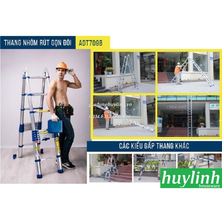 - Thang nhôm rút gọn chữ Advindeq ADT709B là loại thang rút đa năng có thể dựng chữ A cho người sử dụng đứng mà không cần có điểm dựa vào, ngoài ra thang còn có thể dựng đứng lên chữ I với chiều cao gấp đôi so với chữ A.