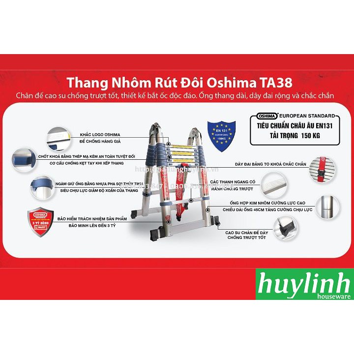 Nhà cửa & Đời sống > Dụng cụ & Thiết bị tiện ích > Thang || Thang nhôm rút đôi chữ A Oshima TA-38 - 3.8 métCòn hàng