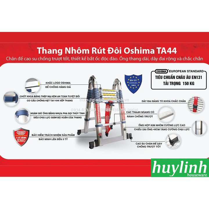 Thang nhôm rút đôi Oshima TA44 thiết kế vô cùng chắc chắn và cứng cáp, thiết kế với chữ I 4.4 mét chữ A tới 2.2 mét có bảo hiểm Bảo Minh lên tới 3 tỷ đồng.Huy Linh phân phối và bảo hành chính hãng tại Oshima Việt Nam.