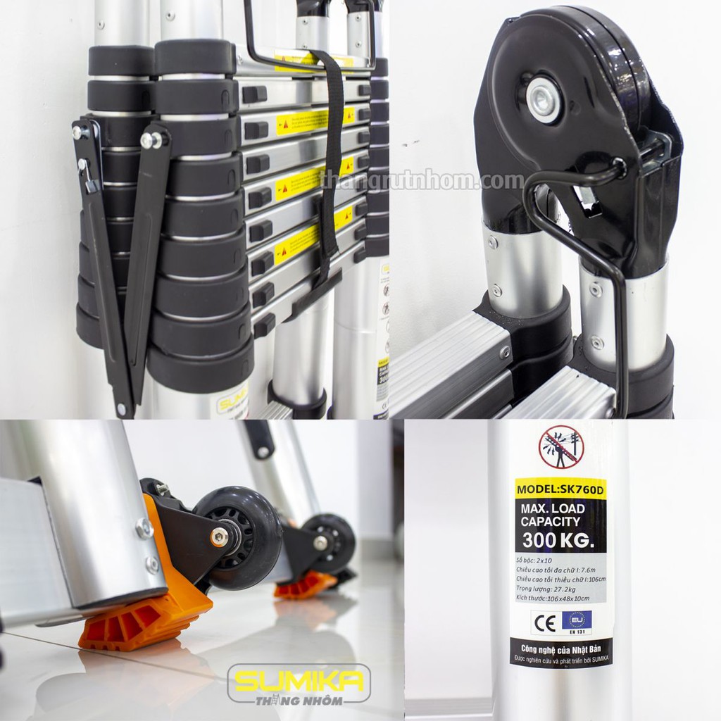 Giới thiệu Thang nhôm rút đôi chữ A SUMIKA SK640D (A:3.2M;I:6.4M) & SK760D (A:3.8M;I:7.6M) NEW 2022 tải trọng 300kg, bảo hành 2 năm