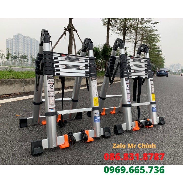 ĐẶC BIỆT: Thang sử dụng 2 chân phụ, hai bánh xe, 4 đế cao su màu vàng + 4 đế cao su đen, gai thang giằng tăng cứng hai bên thang, khóa phụ đỉnh thang