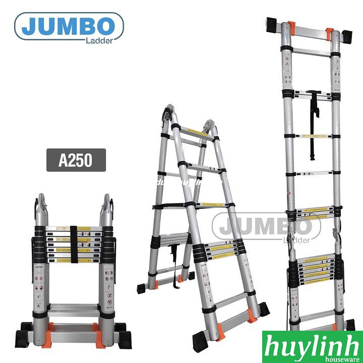 Thang nhôm rút đôi Jumbo A250 có chiều cao chữ I lên tới 5 mét, chiều cao tối đa chữ A 2.5 mét, dễ dàng thu rút gọn tiện lợi.Cấu tạo thang nhôm rút đôi Jumbo A250: