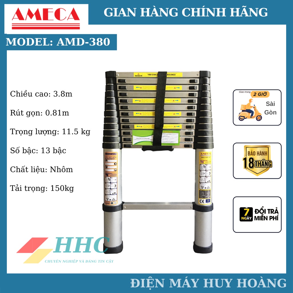 Giới thiệu Thang nhôm rút đơn 13 bậc AMECA AMD-380, thang nhôm rút đơn cao 3,8m