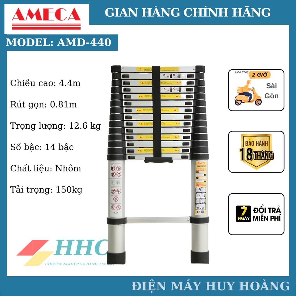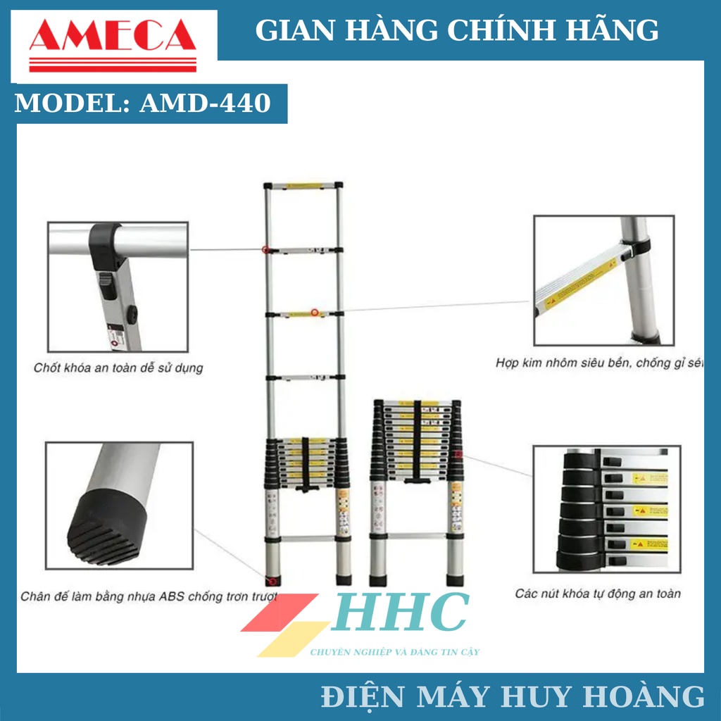 - Thang xếp đơn Ameca AMD-440 có chiều dài tối đa 4,4m chiều cao rút gọn 0,81m. Tuy nhiên, thang có thể thay đổi theo nhiều kích thước khác nhau tùy thuộc vào nhu cầu sử dụng. Khóa an toàn tự động khóa lại sau mỗi lần rút thang giúp chốt cố định bảo đảm mỗi bước thang khi sử dụng được chắc chắn, chống rung lắc hiệu quả.