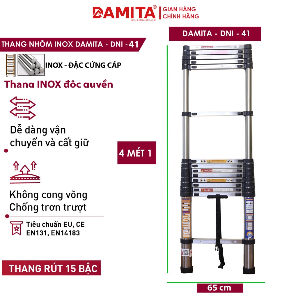 Thang nhôm rút đơn 4.1m INOX DAMITA 2022 mới cao cấp rút gọn đa năng đai an toàn nhựa ABS bảo hành 24 tháng FREESHIP 2h