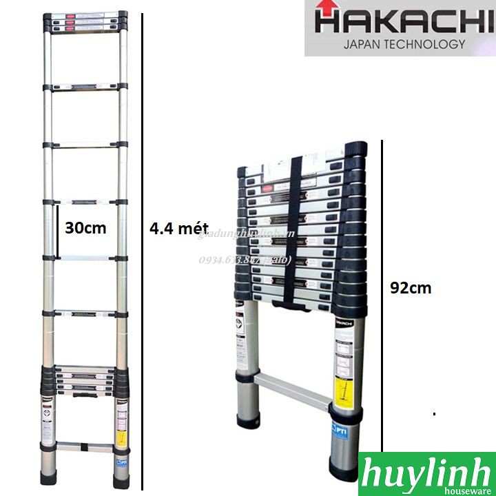 - Với chiều cao tối đa 4,4m khi mở thang, 15 bậc, trọng lượng nhẹ và kích thước khi rút gọn chỉ hơn 92 cm nên Hakachi HT-440CP thiết kế thông minh, đa năng, bền bỉ và an toàn tuyệt đối cho người sử dụng chắc chắn sẽ là lựa chọn hoàn hảo cho gia đình, công ty bạn.
