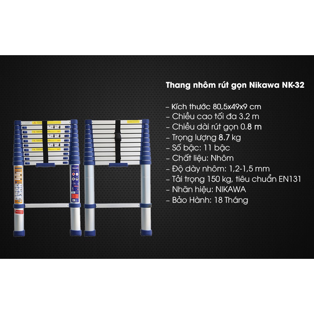 • Thang nhôm rút đơn Nikawa NK-32 thuận tiện cho việc di chuyển và cất giữ:- Thang nhôm rút đơn Nikawa NK-32 thiết kế theo công nghệ tiên tiến của Nhật Bản nên có kiểu dáng đẹp mắt. Với thang nhôm rút đơn gọn Nikawa NK-32 bạn có thể gấp vào, mở ra, cất gọn gàng sau khi sử dụng, mang vác và cất giữ rất thuận tiện.