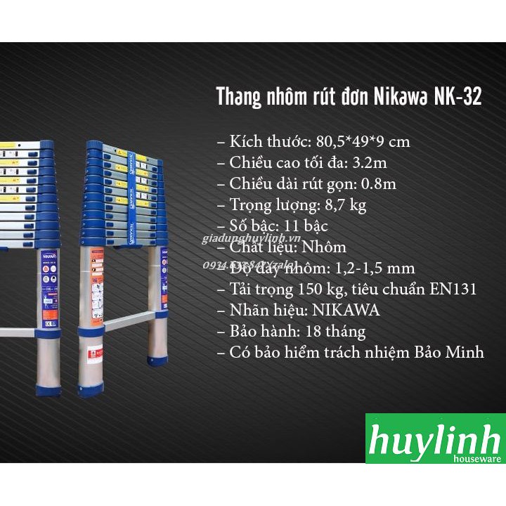 Thang nhôm rút gọn Nikawa NK-32 với kích thước tới 3.2 mét, nhỏ gọn, dễ dàng xếp gọn, di chuyển và sử dụng, được bảo hiểm Bảo Minh tới 1 tỉ.Huy Linh phân phối và bảo hành chính hãng tại Nikawa Việt Nam