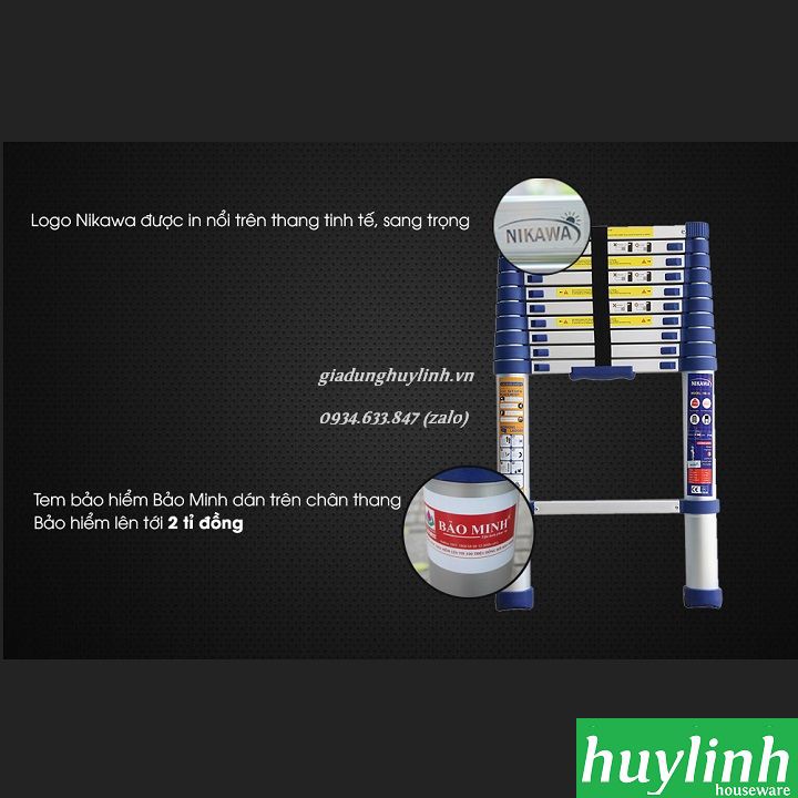 - Với màu xanh nổi bật thang và hộp đựng thang được trang trí bắt mắt. Thang nhôm rút đơn Nikawa là sản phẩm cao cấp với chất lượng vượt trội so với các sản phẩm khác trên thị trường.