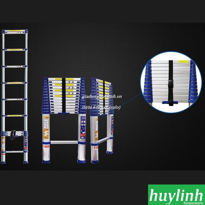 - Dây đen ở bậc cuối cùng của thang có tác dụng gói thang lại sau khi sử dụng. Hai ống chân thang dưới có dán tem hướng dẫn sử dụng và tem có ghi thông số kỹ thuật đầy đủ của thang. Ngoài ra, để không phải mua phải hàng giả hàng nhái bạn nên kiểm tra tem chống hàng giả của bộ công an và tem Bảo hiểm Bảo Minh.