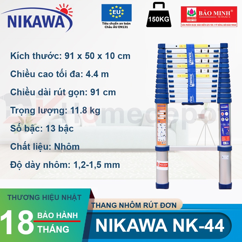 - Thang nhôm rút đơn Nikawa NK-44 cũng có 13 bậc thang giống như thang nhôm rút đơn Nikawa NK-38 tuy nhiên độ cao các bậc của chúng lại khác nhau. Chiều cao các bậc của thang NIkawa NK-44 là 33cm còn của thang Nikawa NK-38 là 30cm.