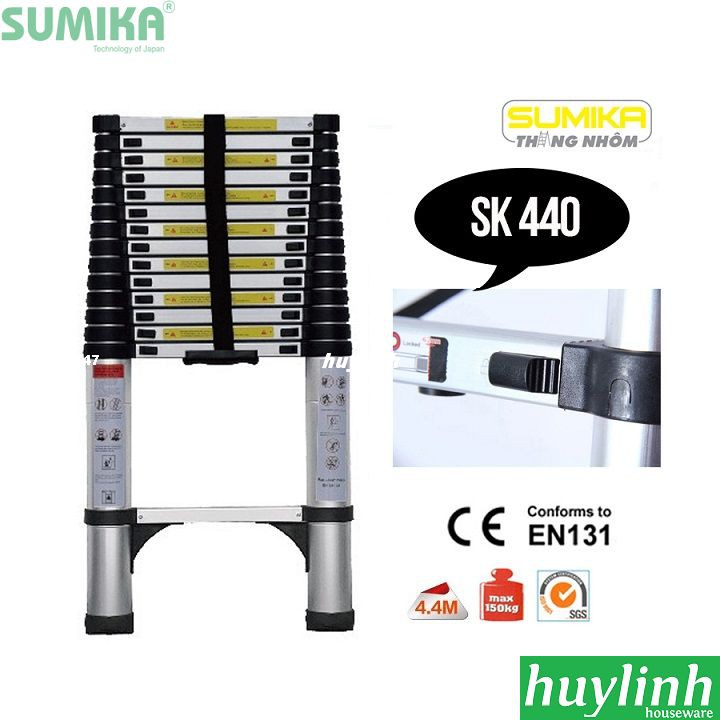Thang nhôm rút đơn Sumika SK440 có độ cao tối đa 4.4m, với số bậc thang là 15, tải trọng lên tới 150kg.Thiết kế rút gọn, ứng dụng rộng rãi