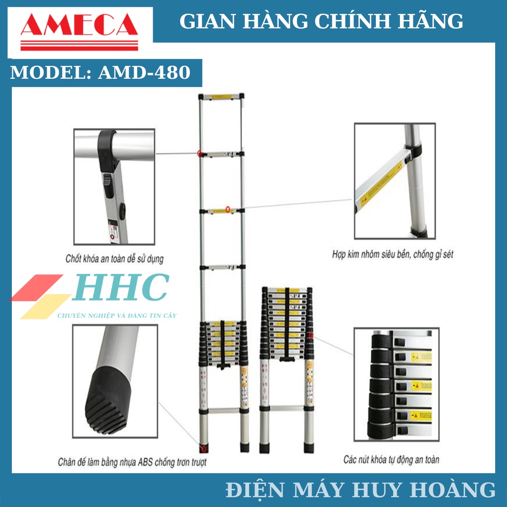 Ameca AMD-480 là sản phẩm thang nhôm hiện đại được sản xuất theo tiêu chuẩn quốc tế an toàn về chất lượng. Với tính ứng dụng cao nên thang xếp đơn Ameca AMD-480 được sử dụng rộng rãi trong đời sống như sửa chữa đồ vật trên cao, thay lắp bóng đèn, vệ sinh nhà cửa. Sản phẩm cũng sử dụng nhiều trong ngành xây dựng, điện lực, điện tử, viễn thông,….Hiện nay ameca.vn là địa chỉ phân phối thang nhôm Ameca chính hãng chất lượng tại Việt Nam.Những bộ phận chi tiết thang được thiết kế một cách tỉ mỉ, chân thang có đế làm bằng nhựa ABS chống trơn trượt trong quá trình sử dụng