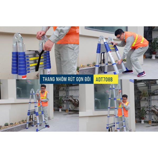 – Ngoài thiết kế kiểu chữ A, thang ADT708B dựng theo kiểu chữ I sử dụng cho các công trình xây dựng, ngành điện lực, thợ viễn thông..