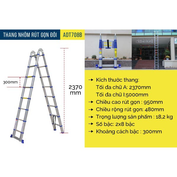 CÔNG DỤNG:– Thang nhôm chữ rút gọn Advindeq ADT708B gấp chữ A có thể dùng trong gia đình phù hợp với sơn sửa nhà cửa, thay bóng đèn… và phù hợp cho các kho hàng, xưởng sản xuất, siêu thị nhà sách.