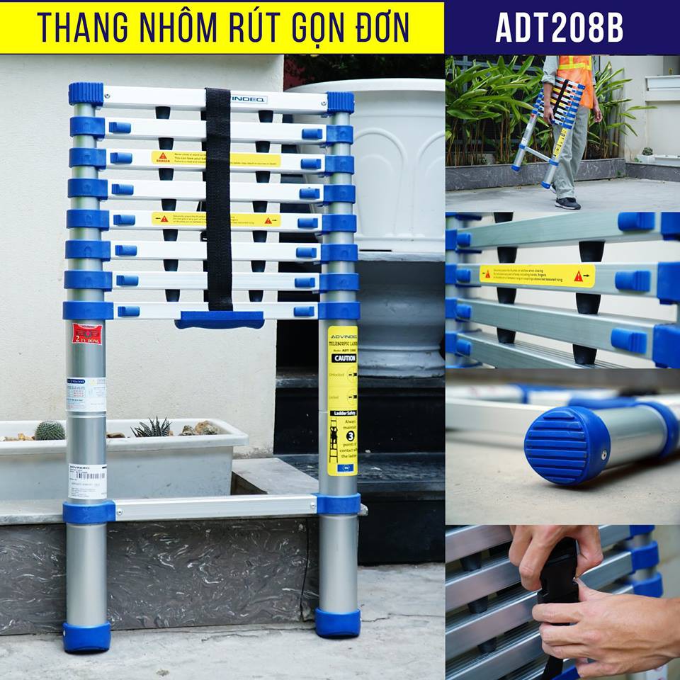 SẢN PHẨM BẢO HÀNH 2 NĂM TRÊN TOÀN QUỐC VÀ SẢN PHẨM ĐÃ ĐƯỢC MUA BẢO HIỂM BẢO MINH CHO NGƯỜI SỬ DỤNG VÀ THIẾT BỊ VỚI TRỊ GIÁ 2 TỶ ĐỒNGĐược sản xuất bởi thương hiệu Advindeq nổi tiếng với dây chuyền công nghệ đạt tiêu chuẩn quốc tế, thang nhôm rút gọn đơn Advindeq ADT208B là 1 trong những loại thang nhôm được nhiều người tin dùng với chất lượng đảm bảo, tính tiện lợi và linh hoạt khi sử dụng.
